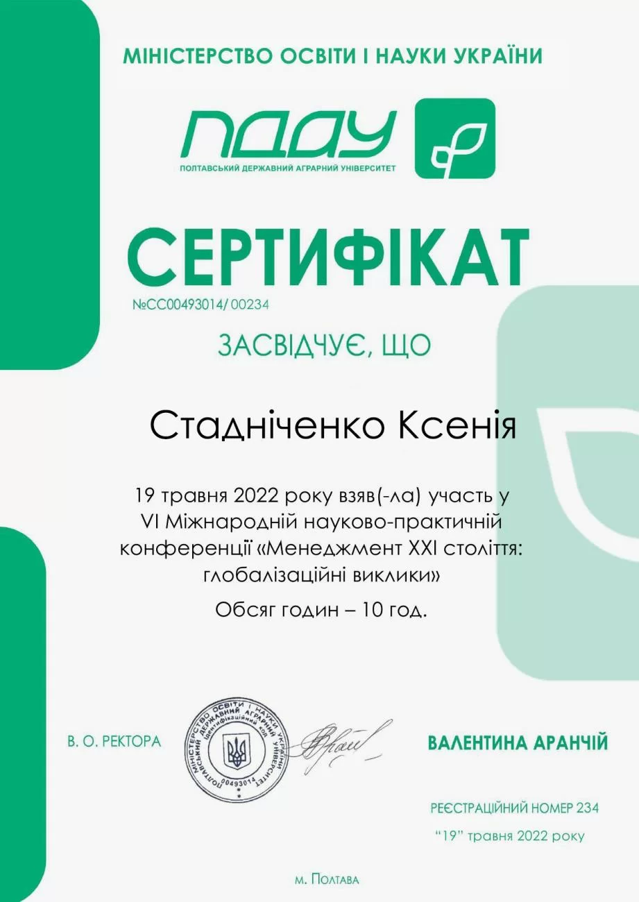 Zertifikat Nr. СС00493014/00234 über die Teilnahme an der Internationalen wissenschaftlich-praktischen Konferenz „Management des 21. Jahrhunderts: globale Herausforderungen“, die am 19. Mai 2022 in Poltawa stattfand