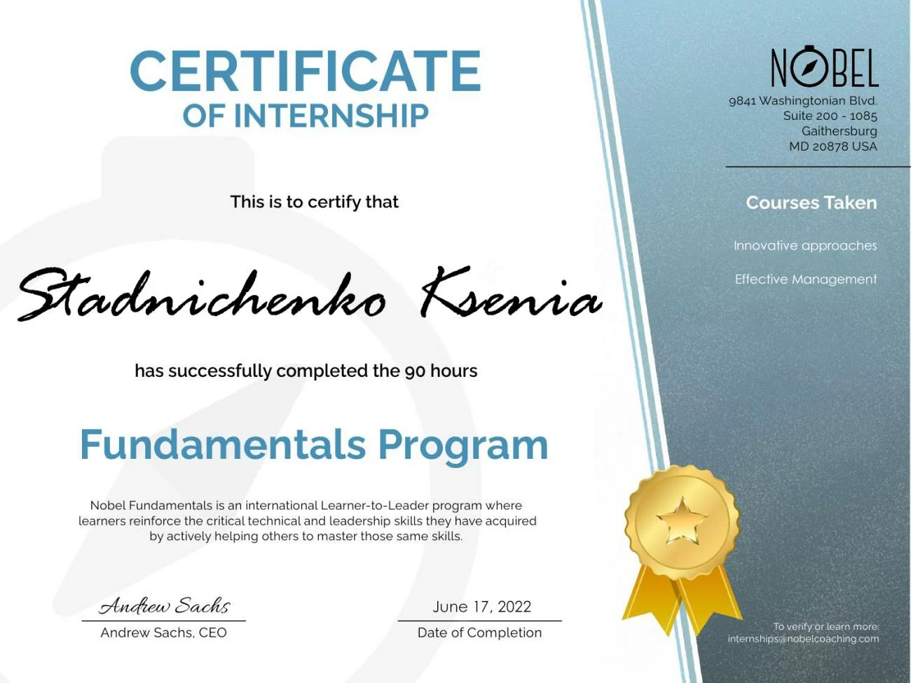 Zertifikat über den Abschluss eines fundamentalen Schulungsprogramms mit den Kursen „Innovative Ansätze und effektives Management“, ausgestellt am 17. Juni 2022