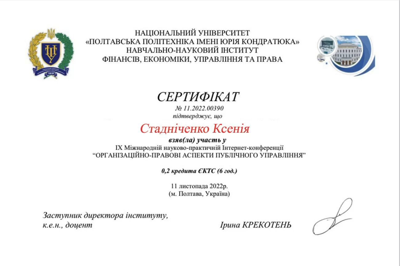 Zertifikat über die Teilnahme an der IX. Internationalen wissenschaftlich-praktischen Online-Konferenz „Organisations- und rechtliche Aspekte der öffentlichen Verwaltung“, ausgestellt am 11. November 2022 in Poltawa (Zertifikat Nr. 11.2022.00390)
