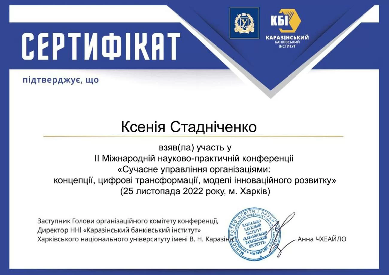 ![Zertifikat über die Teilnahme an der Zweiten Internationalen wissenschaftlich-praktischen Konferenz „Modernes Organisationsmanagement: Konzepte, digitale Transformationen, Modelle innovativer Entwicklung“, die am 25. November 2022 in Charkiw stattfand Zertifikat über die Teilnahme an der Zweiten Internationalen wissenschaftlich-praktischen Konferenz „Modernes Organisationsmanagement: Konzepte, digitale Transformationen, Modelle innovativer Entwicklung“, die am 25. November 2022 in Charkiw stattfand]()