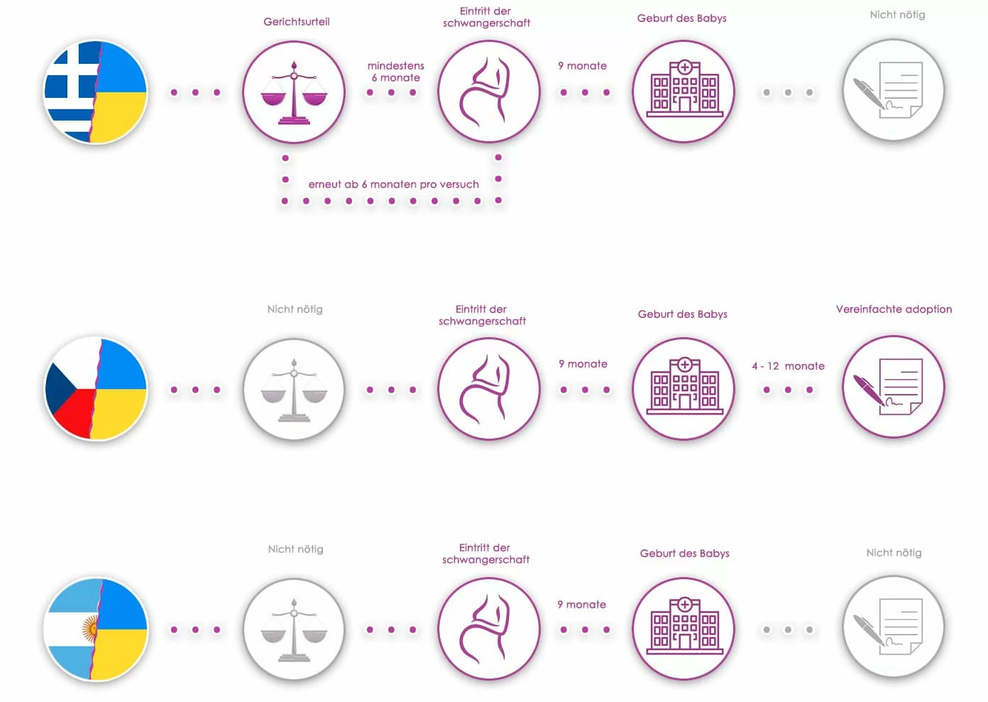 Besonderes Augenmerk wird auf Länder gelegt, in denen eine umfassende rechtliche Interaktion zwischen Klinik, Leihmutter, Eltern und Regierungsbehörden erforderlich ist: Großbritannien, Schweden, Norwegen, Dänemark, Niederlande, Spanien, Italien usw.