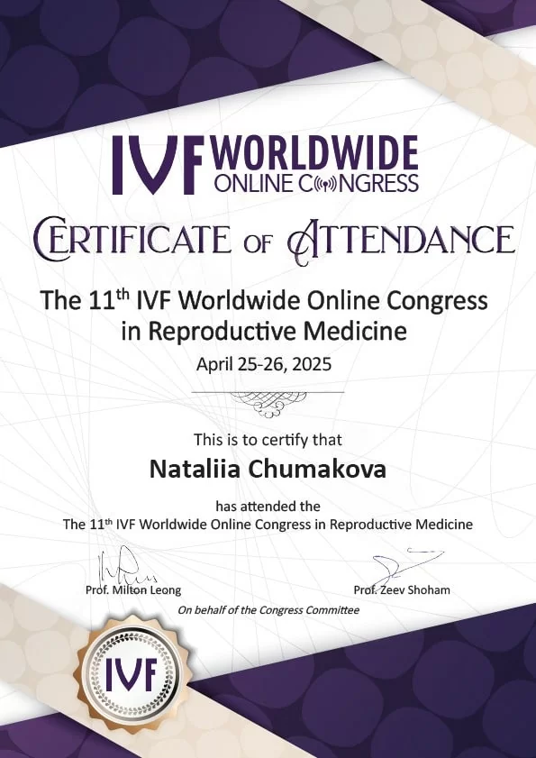 Zertifikat für die erfolgreiche Teilnahme am "11. weltweiten IVF-Online-Kongress für Reproduktionsmedizin" zum Thema Reproduktionsmedizin, der am 25. und 26. April 2025 stattfand